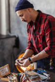 Wąsy szewc z dokonywania pomiarów we wzorach przy stole w warsztacie
