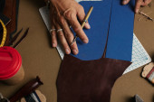 Zdjęcie "Zbliżenie rzemieślnika skórzanego pracującego z naturalną skórą przy użyciu narzędzi rzemiosła." może być wykorzystywane do celów osobistych i komercyjnych zgodnie z warunkami zakupionej licencji Royalty-free. Obraz jest dostępny do pobrania w jakości wysokiej rozdzielczości do 5760x3840.