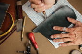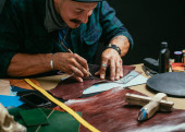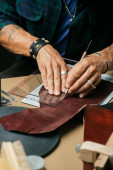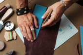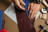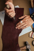 Zbliżenie rzemieślnika skórzanego pracującego z naturalną skórą przy użyciu narzędzi rzemiosła.