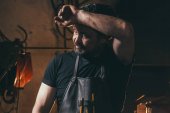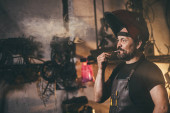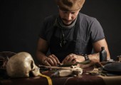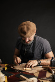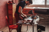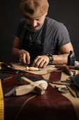 Wąsy szewc z dokonywania pomiarów we wzorach przy stole w warsztacie