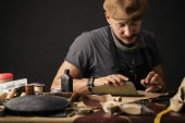 Zdjęcie "Wąsy szewc z dokonywania pomiarów we wzorach przy stole w warsztacie" może być wykorzystywane do celów osobistych i komercyjnych zgodnie z warunkami zakupionej licencji Royalty-free. Obraz jest dostępny do pobrania w jakości wysokiej rozdzielczości do 5760x3840.