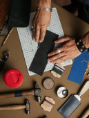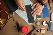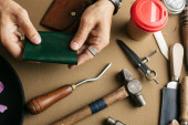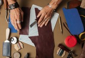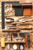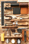Zestaw narzędzi rzemiosła skórzanego na papierowym tle. Miejsce pracy szewca.