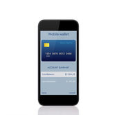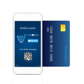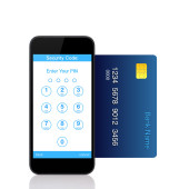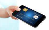 na białym tle kobiece ręce trzymając telefon i karta kredytowa i wprowadź