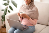 Pasja domowa. Wesoła Arabka ogląda filmy na laptopie i pije kawę