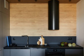 Stylowa kuchnia z białymi blatami, ścianą, szafkami i szufladami oraz czarnym zlewem, okapem kuchennym i płytą indukcyjną