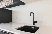 Zdjęcie "Stylowa kuchnia z białymi blatami, ścianą, szafkami i szufladami oraz czarnym zlewem, okapem kuchennym i płytą indukcyjną" może być wykorzystywane do celów osobistych i komercyjnych zgodnie z warunkami zakupionej licencji Royalty-free. Obraz jest dostępny do pobrania w jakości wysokiej rozdzielczości do 5760x3840.