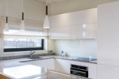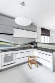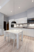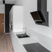 Stylowa czarno-biała kuchnia z drewnianą podłogą i ładne oświetlenie LED