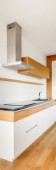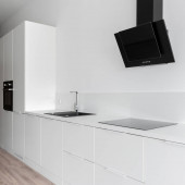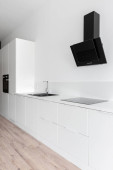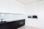 Zdjęcie "Stylowa czarno-biała kuchnia z drewnianą podłogą i ładne oświetlenie LED" może być wykorzystywane do celów osobistych i komercyjnych zgodnie z warunkami zakupionej licencji Royalty-free. Obraz jest dostępny do pobrania w jakości wysokiej rozdzielczości do 5760x3840.