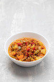 Zdjęcie "Klasyczna wegetariańska zupa warzywna minestrone w białej misce na betonowym tle. Widok z góry" może być wykorzystywane do celów osobistych i komercyjnych zgodnie z warunkami zakupionej licencji Royalty-free. Obraz jest dostępny do pobrania w jakości wysokiej rozdzielczości do 5760x3840.