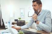 Młody, zadumany architekt analizuje problem z planami nowego projektu w biurze..