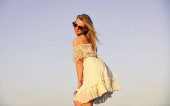 Zdjęcie "Wakacje. Letnia sukienka modelki. Wolność. Dziewczyna w okularach przeciwsłonecznych kopiuje przestrzeń. Pod koniec lata. Koncepcja Afterparty. Wschód słońca niesie wysokie obcasy w dłoni. Kobieta na słonecznym poranku błękitne niebo" może być wykorzystywane do celów osobistych i komercyjnych zgodnie z warunkami zakupionej licencji Royalty-free. Obraz jest dostępny do pobrania w jakości wysokiej rozdzielczości do 5760x3840.