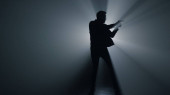 Sylwetka człowieka tańczącego w klubie z niebieskim neonowym błyskawicą i dymem.