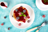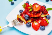 Zdjęcie "Naleśniki serowe wiejskie ze świeżymi jagodami i sosem truskawkowym. Zdrowe i zabawne śniadanie dla dzieci. Dojrzałe jagody, pachnące liście mięty, sztućce. Delikatne niebieskie tło, widok z góry" może być wykorzystywane do celów osobistych i komercyjnych zgodnie z warunkami zakupionej licencji Royalty-free. Obraz jest dostępny do pobrania w jakości wysokiej rozdzielczości do 5760x3840.