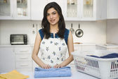 Szczęśliwa piękna młoda kobieta w żółtych rękawiczkach sprząta kuchnię specjalnym wyposażeniem i sprayem. Roboty domowe i sprzątanie