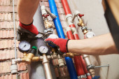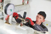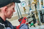 inżynier grzewczy lub hydraulik w kotłowni instalujący manometr rurociągu