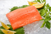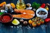 Kawałek łososia czerwonego z dodatkami do gotowania na białym tle