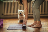 Młoda kobieta medytuje jogę w salonie w domu. Medytuje na macie w porannym słońcu, wspierając ją swoim psem..
