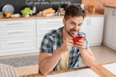 Mężczyzna z czajnikiem elektrycznym i filiżanką w domu