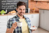 Młodzieniec z czajnikiem elektrycznym pokazujący gest kciuka w domu