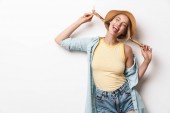 Zdjęcie "Zdjęcie wesołej pięknej kobiety w kapeluszu śmiejącej się podczas pozowania z kwiatami odizolowanymi na beżowym tle" może być wykorzystywane do celów osobistych i komercyjnych zgodnie z warunkami zakupionej licencji Royalty-free. Obraz jest dostępny do pobrania w jakości wysokiej rozdzielczości do 5760x3840.