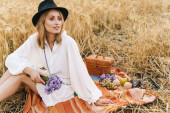 Zdjęcie pięknej szczęśliwej kobiety w stylowej sukience uśmiechniętej podczas spaceru z kwiatami na polu pszenicy