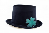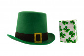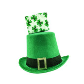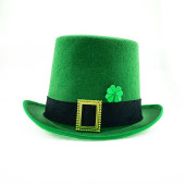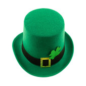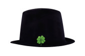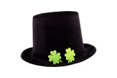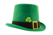 wysoki zielony melonik kapelusz ze złotą klamrą i koniczynkowym symbolem szczęścia na białym, odizolowanym tle