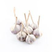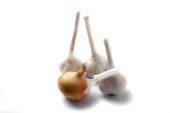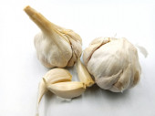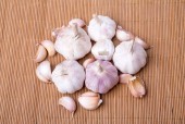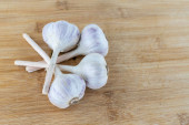 świeża głowa czosnku trzy warzywa korzeniowe stoi na drewnianej macie