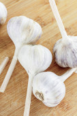 żniwa świeżych ząbków czosnku leży wśród głów zbliżenie na drewnianym tle
