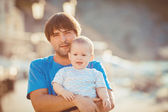 Portret rodziny szczęśliwy człowiek i niemowlę dziecko zabawy przez błękitne morze w sezonie letnim