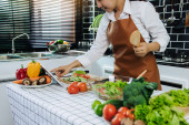 Zdjęcie "Azji kobieta wyciska majonez na talerzu sałatki w kuchni gotowania tabeli." może być wykorzystywane do celów osobistych i komercyjnych zgodnie z warunkami zakupionej licencji Royalty-free. Obraz jest dostępny do pobrania w jakości wysokiej rozdzielczości do 5760x3840.