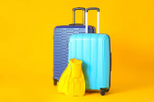 Spakowana walizka na kolorowe tło. Koncepcja podróży