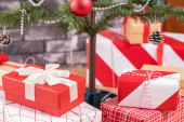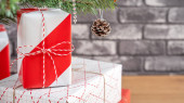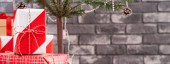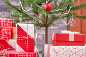 Ozdobiona choinka z owinięte piękne czerwone i białe prezenty w domu z czarnej cegły ściany, świąteczny projekt koncepcji, zbliżenie.