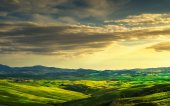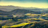 Toskania krajobraz, małe jezioro, zielone i żółte pola na Krecie Senesi. Włochy, Europa.