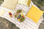 Płaskie układanie kompozycji szczotek i produktów kosmetycznych z gałązką oliwną i ręcznikiem na szarym tle