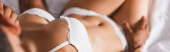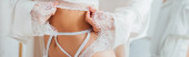 Pozioma uprawa panny młodej w majtkach i koronkowej podwiązce dotykającej zasłon