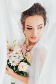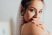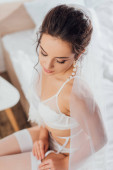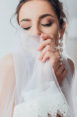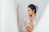 Selektywne skupienie panny młodej w welonie siedzącej w pobliżu lustra i kieliszka wina