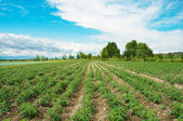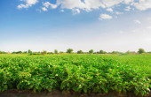 Krajobraz plantacji zielonych krzewów ziemniaka. Europejskie rolnictwo ekologiczne. Hodowla żywności na farmie. Rosnąca troska i zbiory. Przemysł rolny i przemysł rolny. Skupienie selektywne