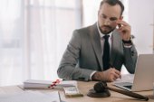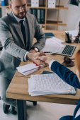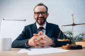 przycięty widok brodatego prawnika siedzącego z zaciśniętymi rękami przy biurku