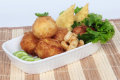 Danie indonezyjskie: smażony ryż (nasi goreng) podawany krakersy krewetkowe na czerwonym talerzu izolowane na białym tle