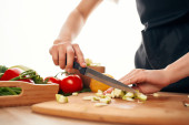 przycięty widok młodej kobiety cięcia ogórka na desce do siekania