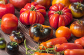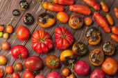 Czerwony pomidor na stole. Wiele pomidorów na drewnianym stole. Lokalnie uprawiane i zrównoważone zbiory