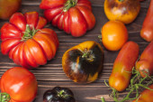 Zdjęcie "Zbiory różnych pomidorów. Piękne dojrzałe różne odmiany pomidorów. Kolorowe pomidory tło lub tekstura." może być wykorzystywane do celów osobistych i komercyjnych zgodnie z warunkami zakupionej licencji Royalty-free. Obraz jest dostępny do pobrania w jakości wysokiej rozdzielczości do 5760x3840.