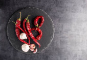 Dwie brzydkie czerwone papryki nadające się do gotowania na szarym talerzu. Czarne tło z młynem pieprzowym i przyprawami, widok z góry z przestrzenią