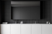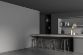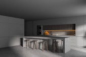 Zdjęcie "Wnętrze stylowej kuchni z szarymi i ceglanymi ścianami, szare szafki i bar ze stołkami. Pionowy plakat makiety. 3d renderowanie" może być wykorzystywane do celów osobistych i komercyjnych zgodnie z warunkami zakupionej licencji Royalty-free. Obraz jest dostępny do pobrania w jakości wysokiej rozdzielczości do 5760x3840.