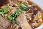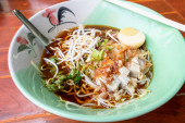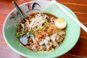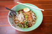 Chrupiące makaron wieprzowy z jajkiem w dużej misce