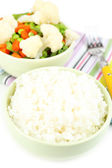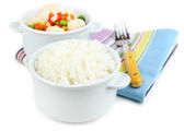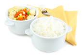 ugotowany ryż z warzywami na drewnianym stole z bliska