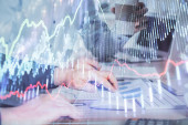Podwójna ekspozycja rąk bizneswoman wpisując komputer i wykres forex hologram rysunek. Koncepcja analizy finansowej.