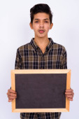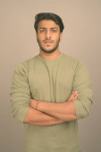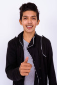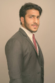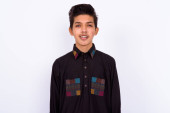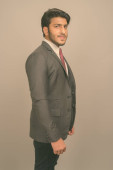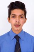 Studio strzał młody przystojny indyjski nastolatek chłopiec jako biznesmen na białym tle