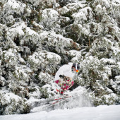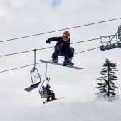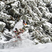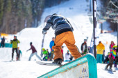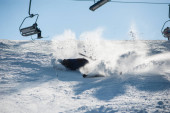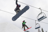 Zdjęcie "Narciarz zjeżdżający z zachmurzonym niebem i wyciągami narciarskimi na tle. Męski freerider na nartach robi skok podczas zjeżdżania po pokrytych śniegiem stokach. Koncepcja ośrodka sportów zimowych i narciarskich." może być wykorzystywane do celów osobistych i komercyjnych zgodnie z warunkami zakupionej licencji Royalty-free. Obraz jest dostępny do pobrania w jakości wysokiej rozdzielczości do 5760x3840.