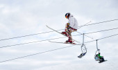 Narciarz zjeżdżający z zachmurzonym niebem i wyciągami narciarskimi na tle. Męski freerider na nartach robi skok podczas zjeżdżania po pokrytych śniegiem stokach. Koncepcja ośrodka sportów zimowych i narciarskich.